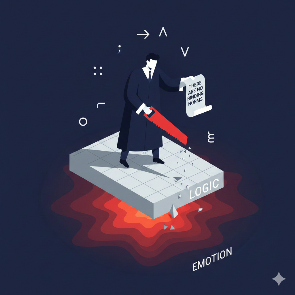 So when emotivism speaks as if inconsistency is a defect, or cruelty is condemnable, it has already crossed the line it claims does not exist.