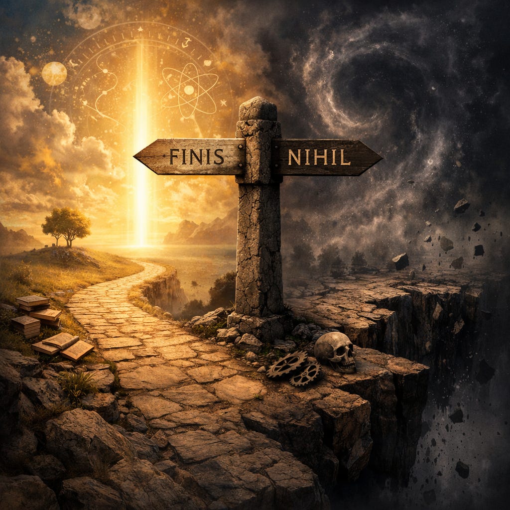 Aut finis, aut nihil. If purpose is real, naturalism is incomplete at best. If purpose is illusory, naturalism is unspeakable, not false but meaningless, a conclusion no one actually reached because reaching conclusions isn’t something that happens in that kind of universe.