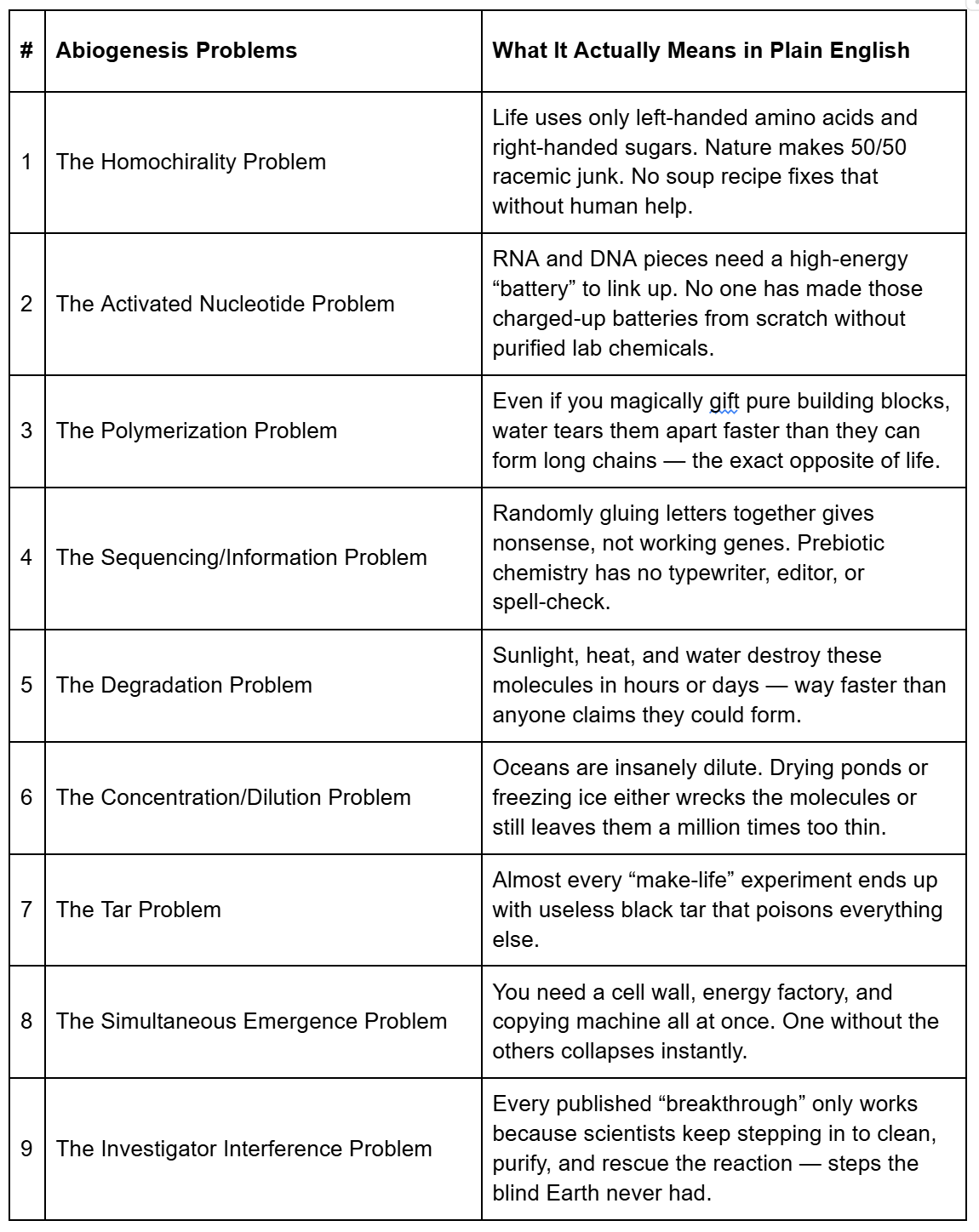 Below is the table he uses in his public lectures. I’ve translated each problem into plain English. When someone says OOL research is “making great progress,” ask them which line on this chart has been solved under real, unguided conditions.